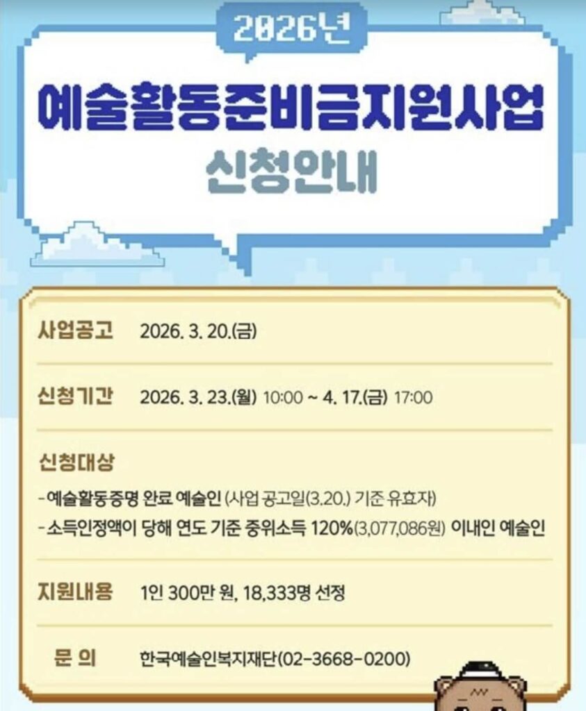 이용신 문화체육관광부 예술정책관은 “예술활동준비금은 예술인들이 어려운 환경 속에서도 활동의 끈을 놓지 않도록 돕는 안전망”이라며 지속적인 지원 의지를 표명했습니다. 자격 요건에 해당하는 예술인이라면 이번 기회를 놓치지 말고 2026 예술활동준비금에 꼭 신청하시기 바랍니다.