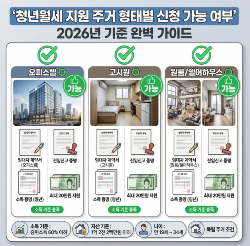 많은 분이 ‘주택’이 아니면 지원 대상에서 제외될 것이라 오해하시곤 합니다. 하지만 정부의 청년월세 한시 특별지원 사업은 실제 거주 형태를 폭넓게 인정합니다.